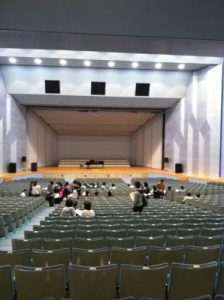 私大の講堂だから、新潟でいったら第四ホールとか、もう少し大きくてもユニゾンプラザとか音文くらいの会場かなあと思っていたんですけども、これがまあ!建物も大きいし、中に入ってまたまたびっくり!広い!とにかくだだっぴろい!あまり傾斜がきつくない客席がずらーーーーーっと広がっています。ギャラリー席や2階席はなし。ワンフロアで、ざっと数えて2000席くらいの座席があります。ひええええええ。新潟の県民会館より座席数多いかも、みたいな・・・。