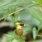体長はおよそ5mmほど。 はじめテントウムシかと思っていたんだけど、近づいてよく見ると、背中に星はなくて真っ黒な羽根。胴体はあざやかなオレンジ色。飛んでる感じはテントウムシそっくり。 調べてみると、クロウリハムシというの … 続きを読む