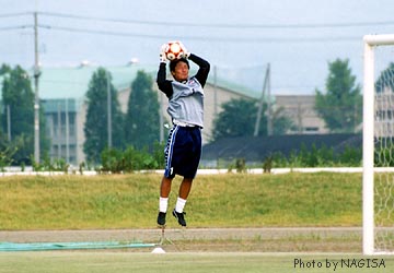| 全国30万「前田っちファン」のみなさま 長らくお待たせいたしました! 渚のページに前田っち初登場でございまーーす。 でかいカラダにむさいヒゲ。よく通る声で、標準語と関西弁を巧みに使い分け、あなたのハートをがっちりわしづかみ。一度練習見学に行ったなら、あなたはもう前田っちの虜でぇ〜す。 とまあ、それはともかく(苦笑)、ゴールキーパーというのは因果なポジションです。 正GKがケガしたり、よほどのへまでもしない限り、交替出場する機会はめったにありません。万一交替で出るチャンスがあっても、その時に一度でもミスをしようものなら、その後二度と使ってもらえないかもしれない。しかもキーパーのミスは即失点につながるだけに、常に緊張を強いられるはず・・・。 そんな状態の中で、黙々と練習を続けるサブキーパーたち。 かれらの練習姿も、また美しいものです。 |